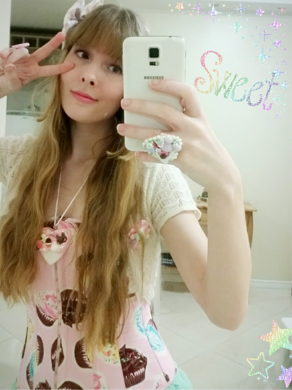 The string is made of satin and the heart has 3 layers of resin. Decorated in the decoden style and full of glitter. The brand tag is made of acrylic. I loved it.